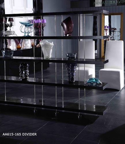 | The exquisite Stafford lustrous black crocodile room divider presents a simple yet elegant design, where four slabs were used to form as open shelves with a polished finish. Supporting the open shelves are stainless steel poles that stand on flat, rounded bases of the same material.