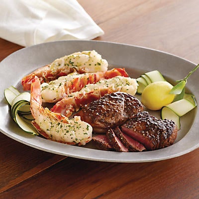 | The Steak and Lobster Feast includes four raw beef tenderloin fillets, hand-selected and cut by expert butchers, and four raw lobster tails fresh from the warm waters of the Caribbean. Our beef tenderloin goes through an aging process to enhance its tenderness and to add flavor. Both of these delicacies are delivered raw, so plan for some gourmet cooking. Steak and lobster are great on the grill or in the broiler. Detailed cooking tips are included.