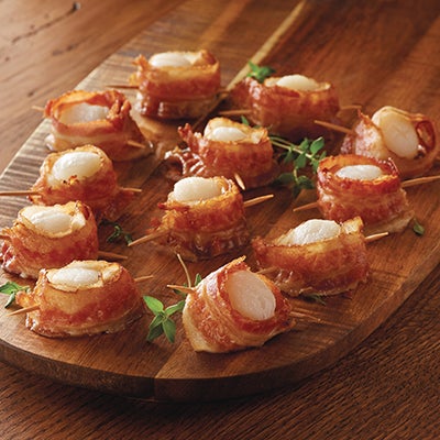 | Enjoy flavorful sea scallops decked out with smoky bacon. Flash frozen to ensure they arrive in peak condition; this shellfish makes a gourmet entrée seared and served with a side of roasted vegetables. Throw in a steak, like our succulent Rib Eye or Complete-Trim Filet Mignon, for a surf-and-turf combo unlike any other.